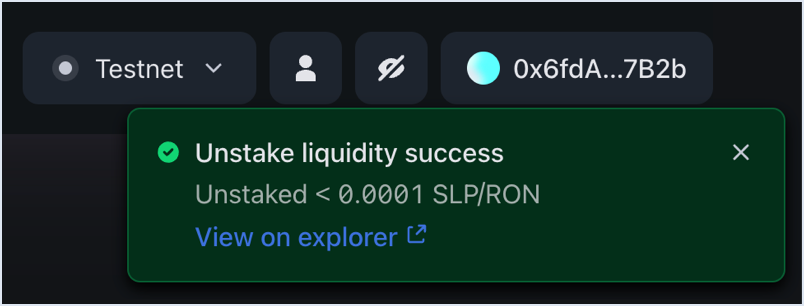 Confirm the transaction in your Ronin Wallet. When the transaction completes, Katana displays a confirmation pop-up.