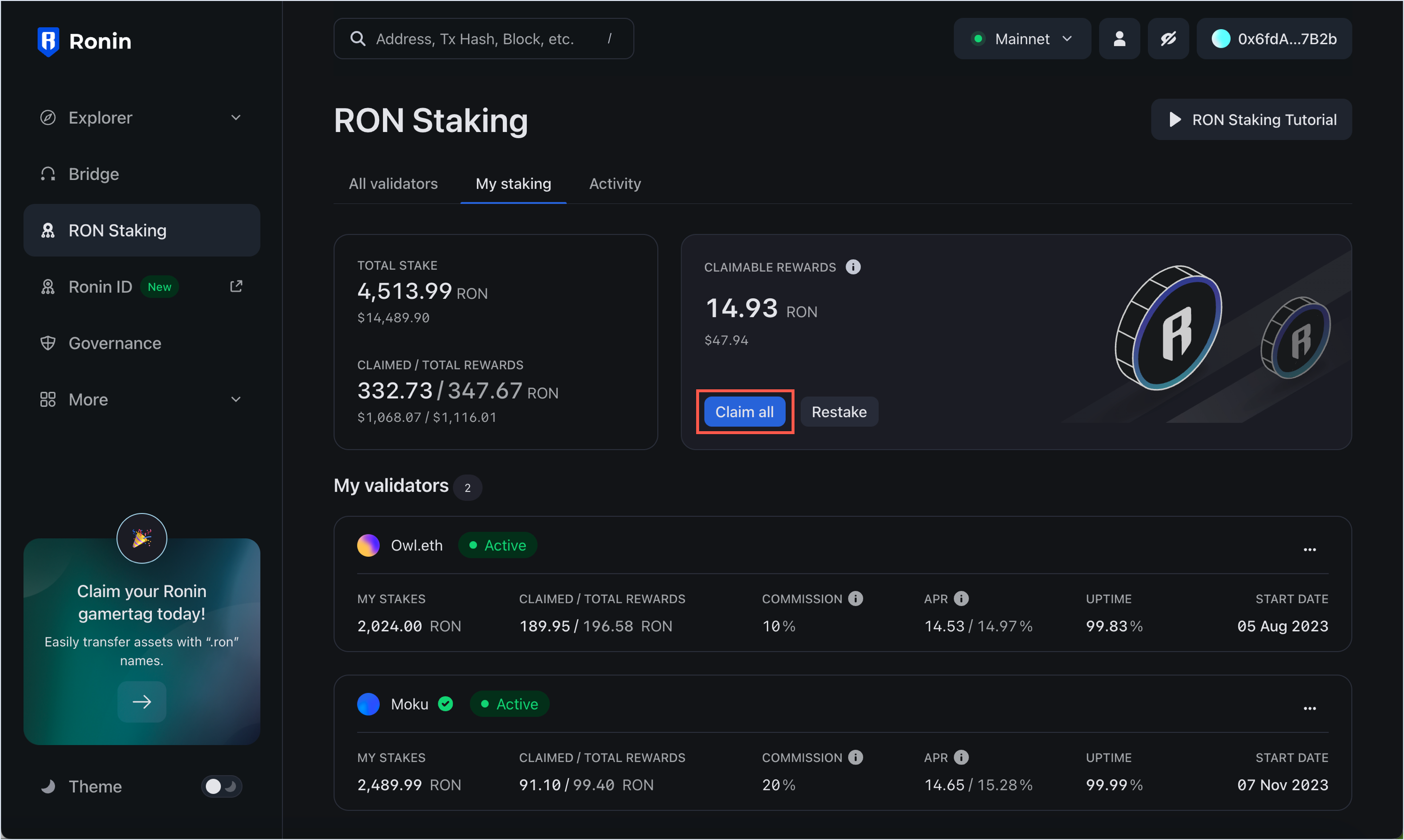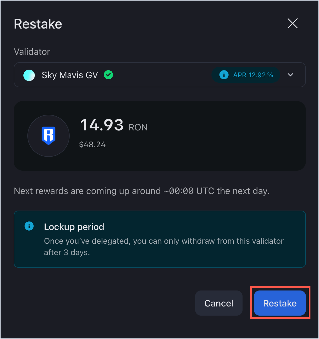 Instead of claiming the RON staking rewards to your Ronin Wallet, you can restake them to your favorite validator, which will increase your staking power.